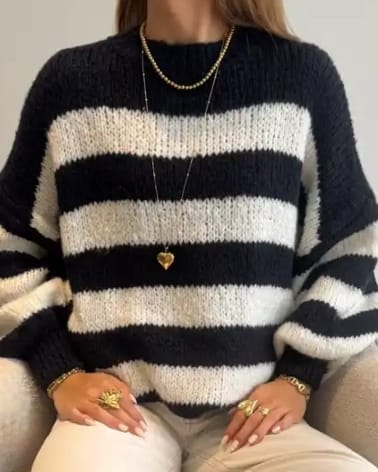 Το πουλόβερ έχει έντονες , οριζόντιες ρίγες που καλύπτουν ολόκληρη την επιφάνειά του , από τους ώμους μέχρι το τελείωμα . Οι ρίγες είναι σε ζωντανές αποχρώσεις , δημιουργώντας ένα τολμηρό και παιχνιδιάρικο αποτέλεσμα . Πλεκτό μαλακό μαλλί , με ελαφρώς χοντρή υφή , ιδανικό για τις κρύες μέρες του χειμώνα . Στρογγυλή και ελαφρώς φαρδιά , με ριπ πλέξη για άνεση . Μανίκια μακριά και φαρδιά , με τις ρίγες να συνεχίζονται αρμονικά και στα μανίκια . Στυλ: Retro και funky , θυμίζει τη μόδα των ’80s , αλλά με μοντέρνα εφαρμογή . ( Οι φωτογραφίες είναι ενδεικτικές )