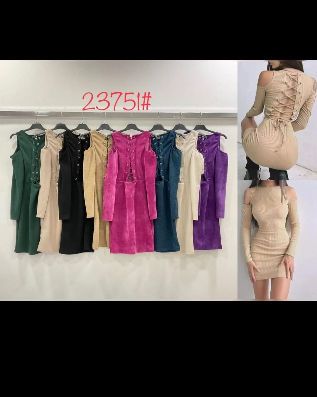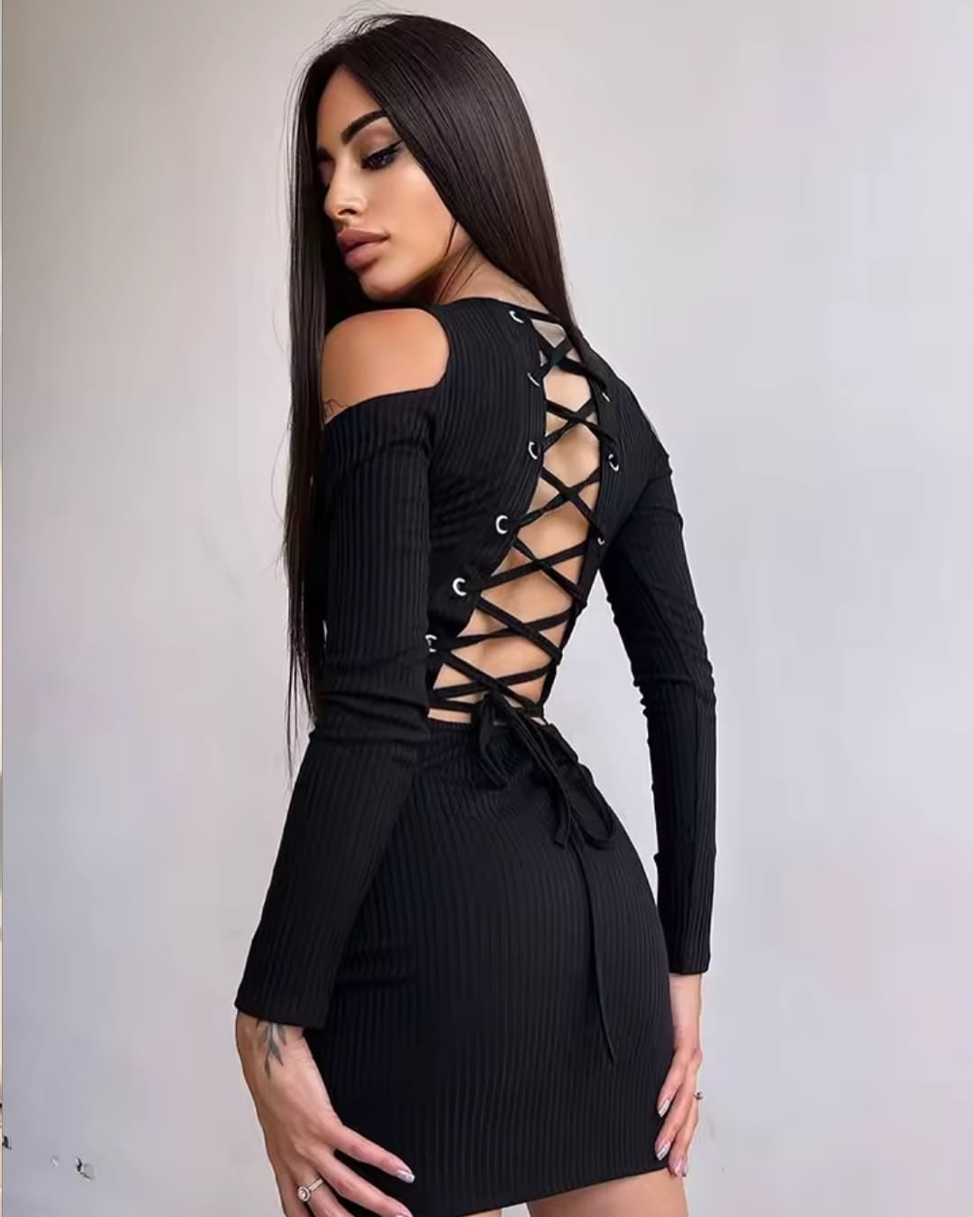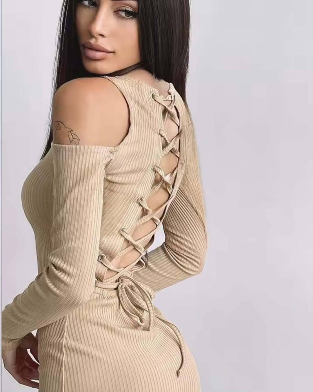 Ένα εντυπωσιακό φόρεμα έξωμο , που αγκαλιάζει τους ώμους με κομψότητα , αφήνοντάς τους γυμνούς για μια αίσθηση θηλυκότητας και φινέτσας . Τα μανίκια 3/4 προσθέτουν μια διακριτική νότα ρομαντισμού , καλύπτοντας το χέρι μέχρι κάτω από τον αγκώνα , ιδανικά για όλες τις εποχές . Η πλάτη του φορέματος είναι ανοιχτή , αποκαλύπτοντας με χάρη το δέρμα , ενώ η διακόσμηση με κορδόνια τύπου κορσέ δημιουργεί ένα εντυπωσιακό οπτικό αποτέλεσμα . Τα κορδόνια διασταυρώνονται σε σχήμα “Χ” , προσθέτοντας μια δόση θεατρικότητας και vintage αισθητικής , θυμίζοντας τα κλασικά κορσέ των προηγούμενων αιώνων .