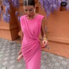 Μίντι φόρεμα , κοντομάνικο με διακοσμητικές σούρες στο μπροστινό μέρος .
