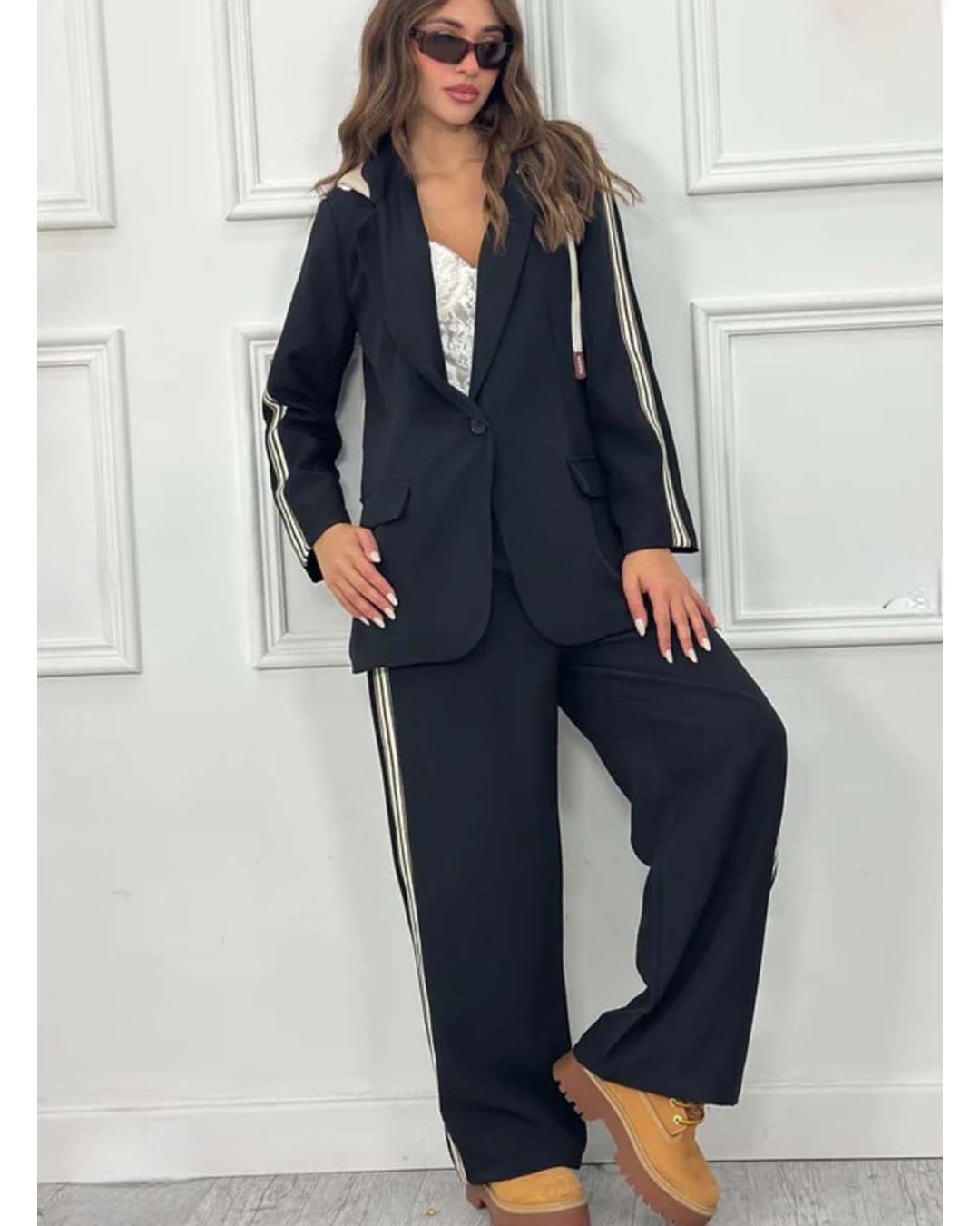 Η γραμμή του σακακιού θυμίζει ελαφρύ αθλητικό jacket , αλλά με πιο προσεγμένη , «σακακίστικη» δομή . Η κουκούλα έχει διχρωμία , αυτό του δημιουργεί έντονη αντίθεση και δίνει πιο streetwear χαρακτήρα . Στο επάνω μέρος υπάρχει κορδόνι , που επιτρέπει ρύθμιση της κουκούλας και προσθέτει μια casual λεπτομέρεια . Το ύφασμα είναι άνετο , με ελαφριά ελαστικότητα, ώστε να συνδυάζει άνεση και στιλ . Το κλείσιμο είναι με κουμπί . Το παντελόνι διαθέτει λάστιχο στη μέση , προσφέροντας άνεση και σταθερή εφαρμογή . Στα πλαϊνά υπάρχει αθλητική ρίγα, που δίνει πιο δυναμικό και μοντέρνο look . Έχει τσέπες , πρακτικές και διακριτικές , που ενισχύουν τον αθλητικό χαρακτήρα . Η γραμμή του είναι straight , ώστε να ταιριάζει με το αθλητικό σακάκι .