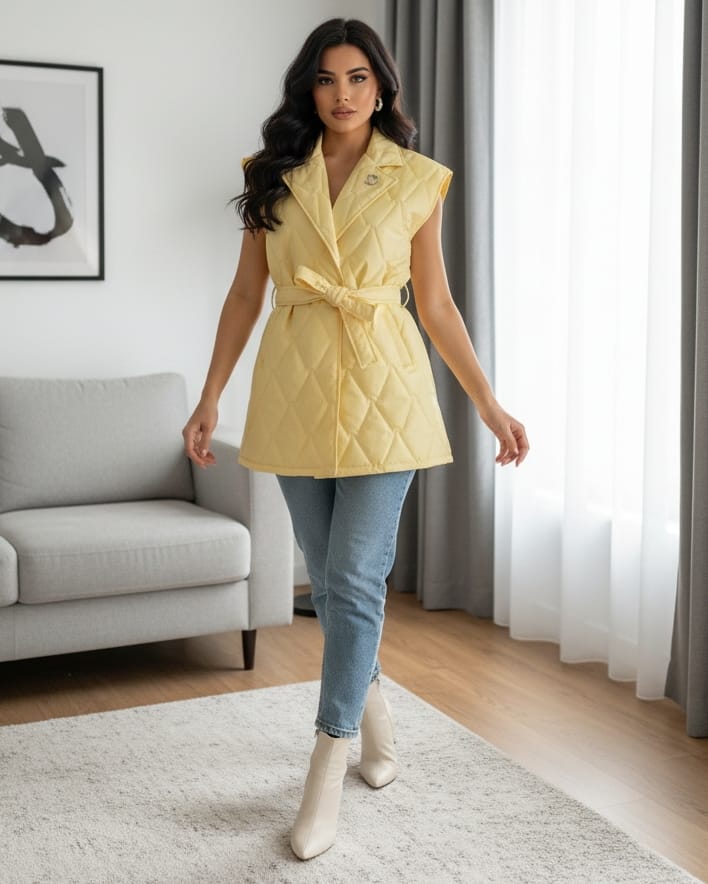 Αμάνικο μπουφάν , καπιτονέ ύφανση με διακριτές ραφές που δημιουργούν ανάγλυφη υφή . Το ύφασμα έχει ελαφριά γυαλάδα , δίνοντας μια πιο premium αίσθηση . Μεσαίο μήκος , με ελαφρώς τονισμένη μέση χάρη στη δική του ζώνη , η οποία είναι από το ίδιο ύφασμα .  Μια διακοσμητική χρυσή καρφίτσα στο πέτο , μικρή αλλά εντυπωσιακή , που λειτουργεί σαν statement στοιχείο και δίνει μια πινελιά πολυτέλειας . Συνδυάζει casual άνεση με chic αισθητική , ιδανικό για layering πάνω από πουλόβερ ή λεπτά πλεκτά .