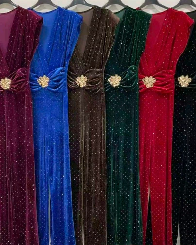 Βελούδινη Ολόσωμη Φόρμα με Ανοιχτό Ντεκολτέ , Στρας και Αγκράφα -Αστραφτερή Αρχοντιά – ” Velour Étoile ” – LO