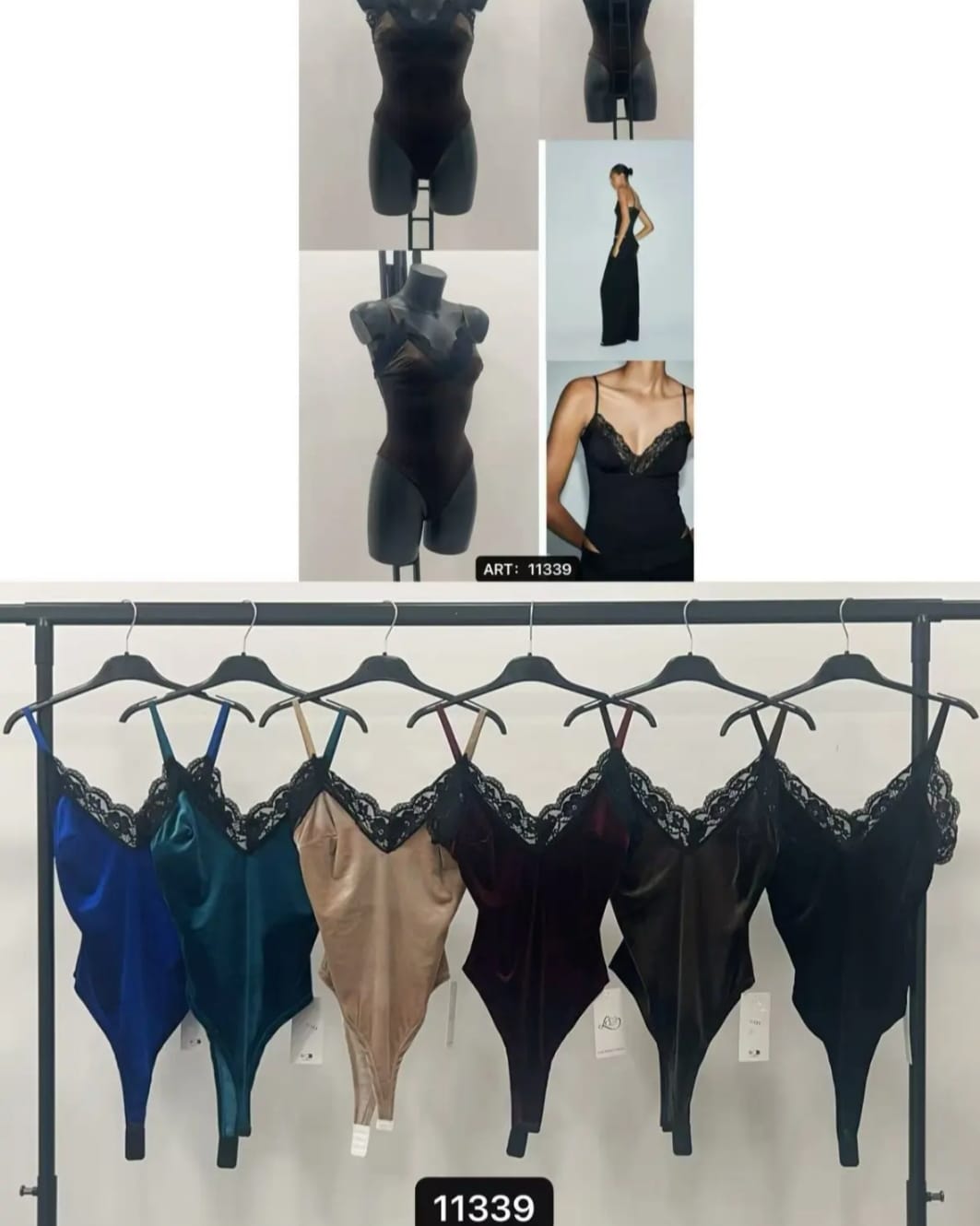 Ένα κορμάκι που συνδυάζει την πολυτέλεια του βελούδου με τη ρομαντική φινέτσα της δαντέλας . Το βασικό ύφασμα είναι πλούσιο βελούδο , απαλό στην αφή και με ελαφριά γυαλάδα που χαρίζει βάθος και κομψότητα . Αγκαλιάζει το σώμα με εφαρμοστή γραμμή , αναδεικνύοντας τη σιλουέτα με διακριτική αισθησιακή διάθεση . Το μπούστο είναι διακοσμημένο με λεπτεπίλεπτη δαντέλα , δημιουργώντας ένα εντυπωσιακό εφέ . Η δαντέλα σχηματίζει ανάλαφρα μοτίβα , προσθέτοντας ρομαντισμό και θηλυκότητα , ενώ αφήνει διακριτικά το δέρμα να φαίνεται , προσδίδοντας μια αίσθηση μυστηρίου . Το κορμάκι μπορεί να φορεθεί μόνο του για πιο τολμηρές εμφανίσεις ή να συνδυαστεί με σακάκι , φούστα ή παντελόνι για ένα πιο sophisticated look . Ιδανικό για βραδινές εξόδους , fashion events ή ακόμα και ως βασικό κομμάτι σε editorial styling .