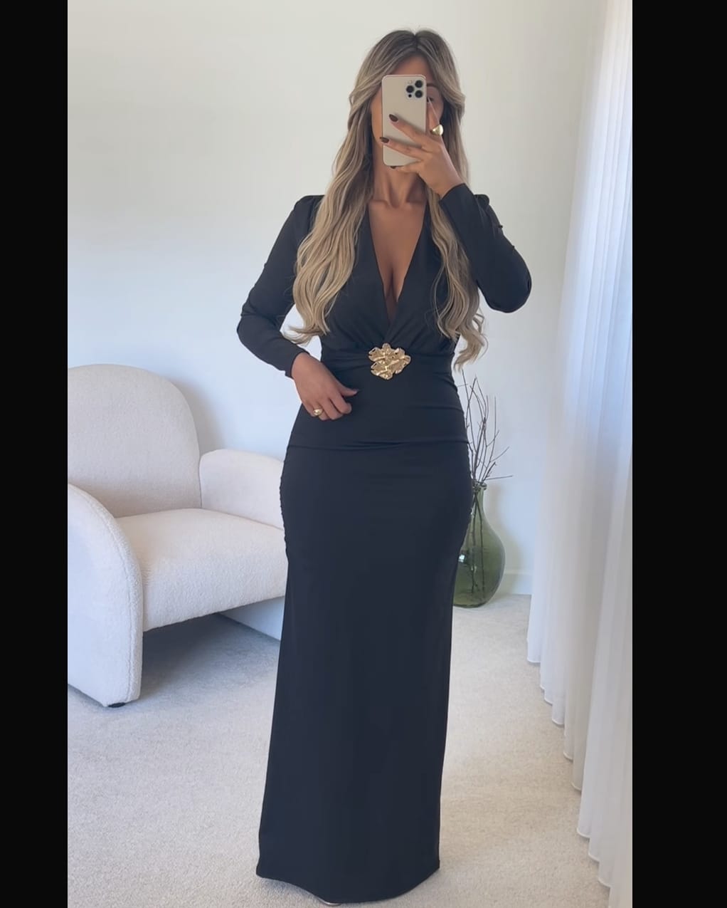 Αναδείξτε τη θηλυκότητά σας με αυτό το εντυπωσιακό μακρυμάνικο εφαρμοστό maxi φόρεμα . Ο σχεδιασμός του συνδυάζει κομψότητα και άνεση , ενώ η V λαιμόκοψη προσθέτει αισθησιακή γραμμή που κολακεύει κάθε σιλουέτα . Η χρυσή  διακοσμητική αγκράφα στη μέση χαρίζει μια πινελιά πολυτέλειας και κάνει το φόρεμα ιδανικό για βραδινές εμφανίσεις , επίσημα events ή κομψές εξόδους .