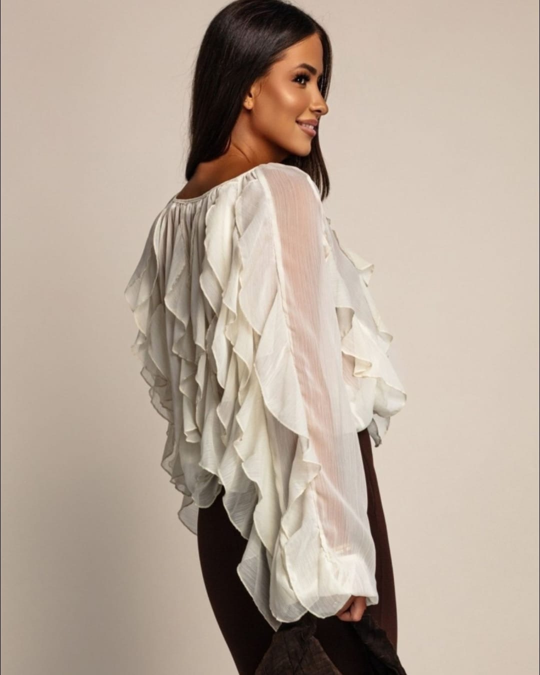 Γυναικείο πουκάμισο με βολάν σε μανίκια και σώμα, απλό V γιακάς – κομψό και θηλυκό – ”Volant V‑Neck Shirt” – AD