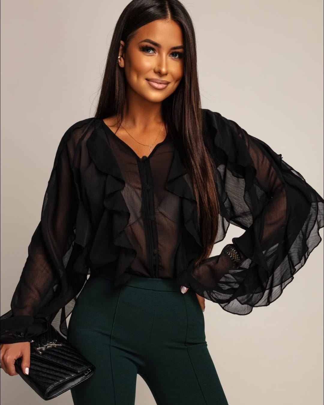 Αναβάθμισε την κομψότητα της γκαρνταρόμπας σου με αυτό το γυναικείο πουκάμισο . Ο σχεδιασμός του συνδυάζει βολάν στα μανίκια και στο σώμα , προσδίδοντας θηλυκότητα και ρομαντική διάθεση , ενώ ο απλός V γιακάς χαρίζει minimal αισθητική και ευκολία στους συνδυασμούς . Ιδανικό για καθημερινές εμφανίσεις αλλά και για πιο ιδιαίτερες περιστάσεις , αποτελεί ένα must‑have κομμάτι για κάθε γυναίκα που αγαπά το στυλ .