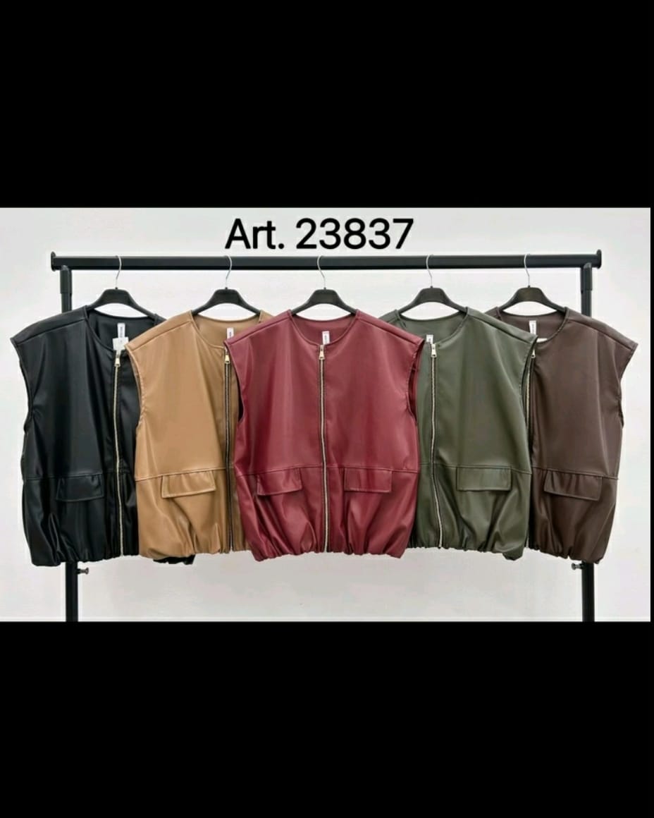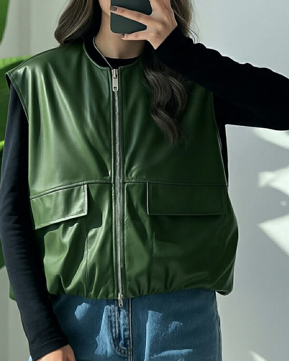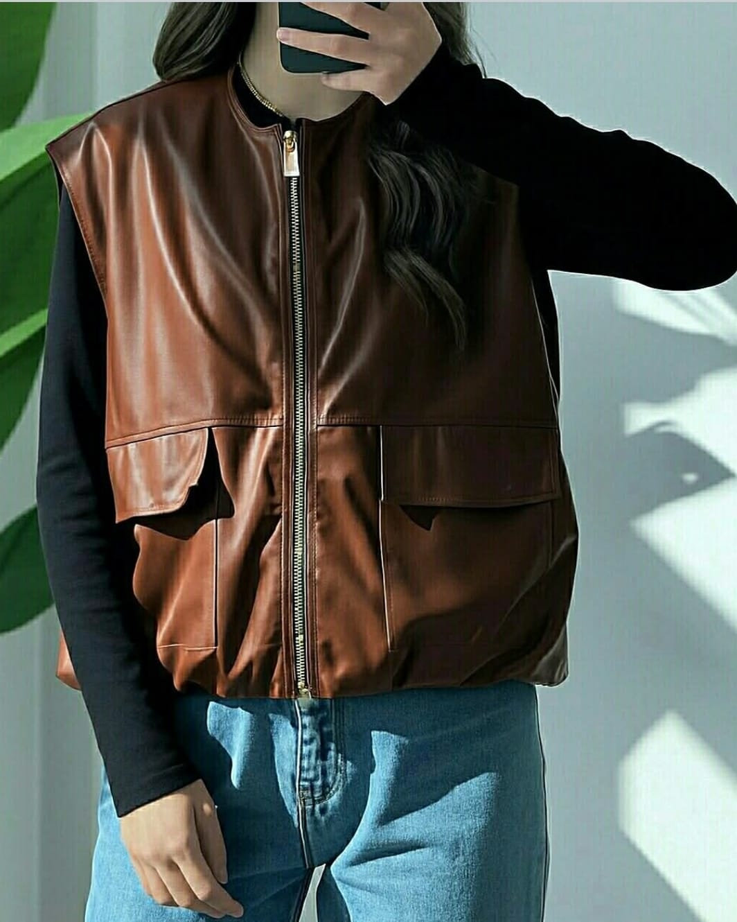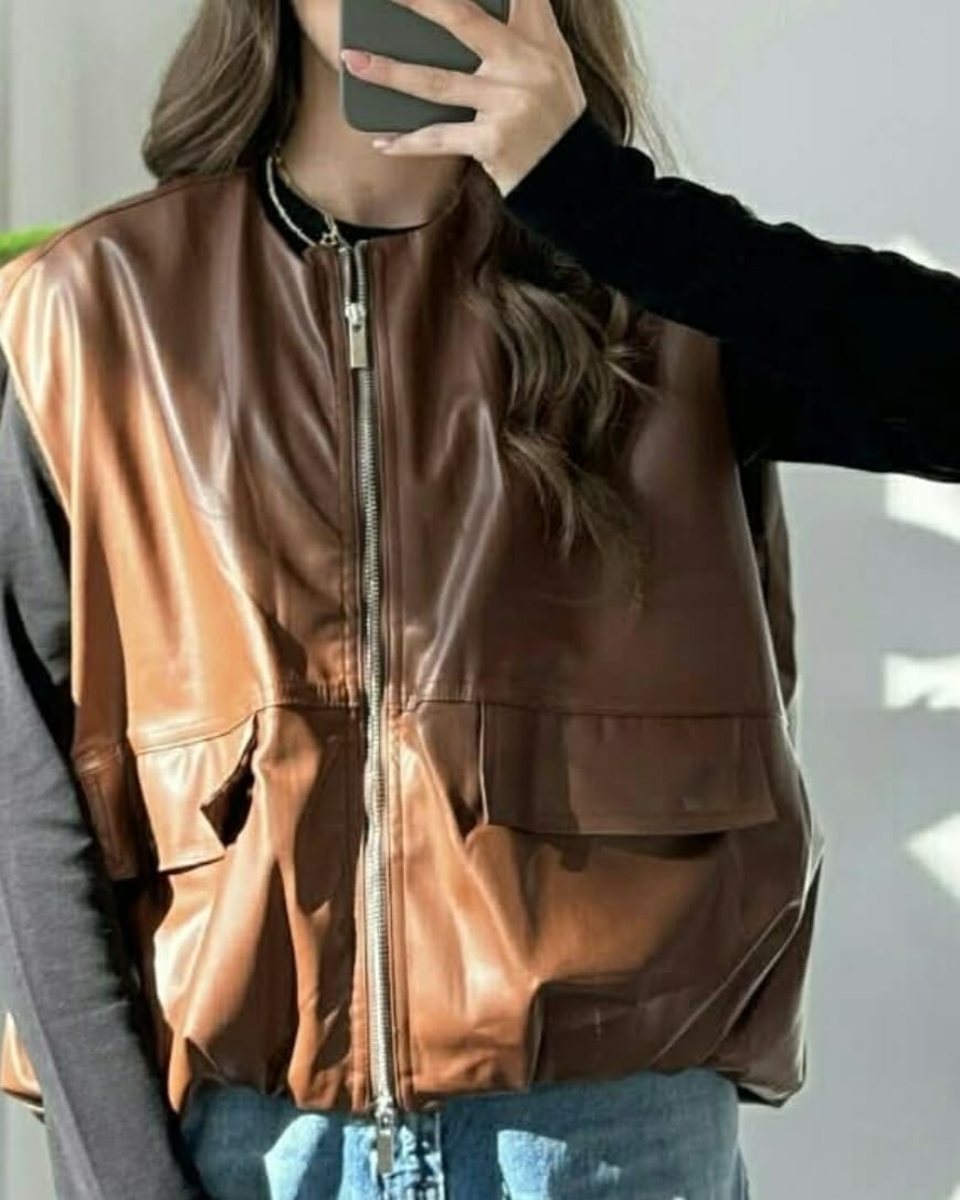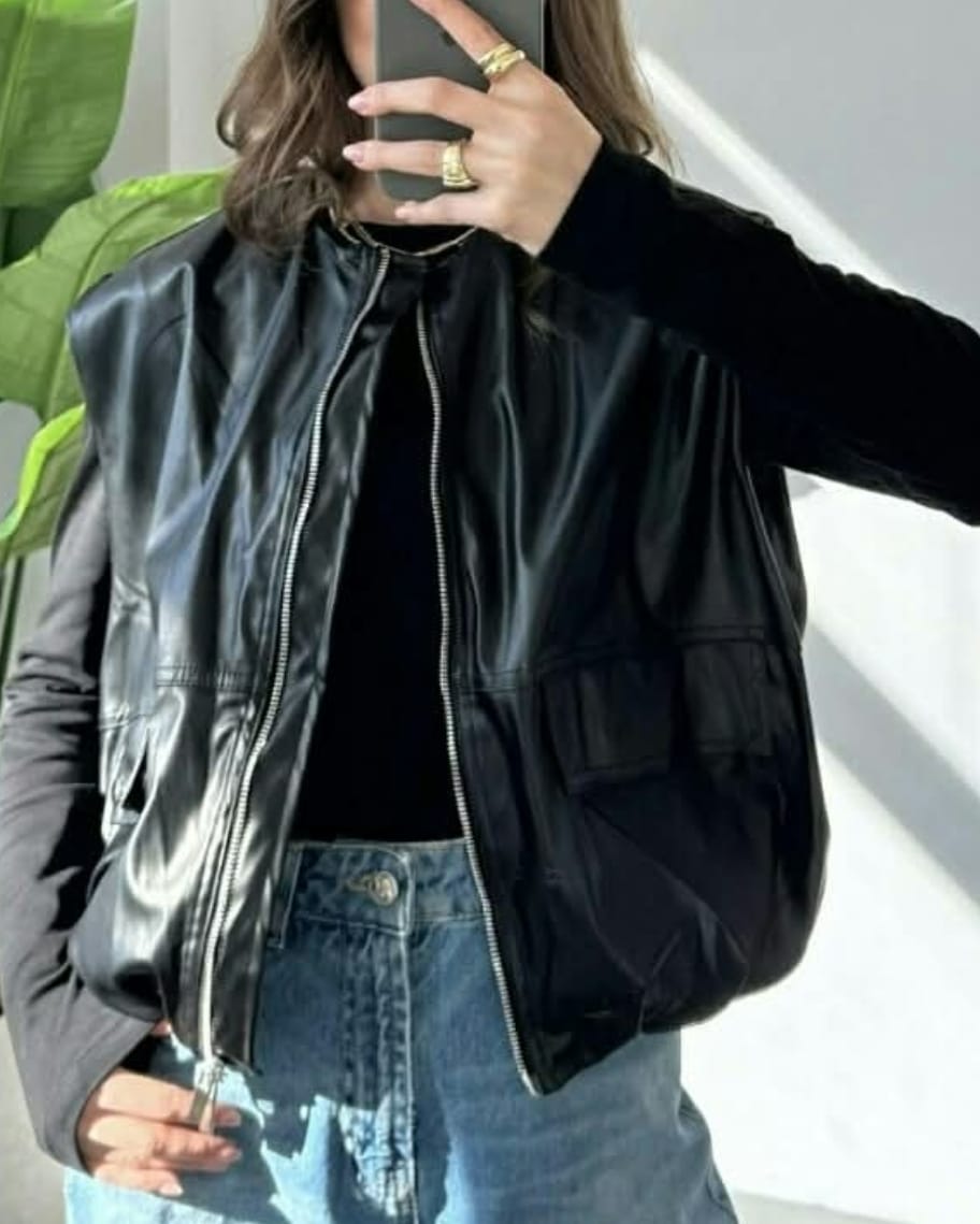 Δυναμικό και μοντέρνο δερμάτινο γιλέκο που συνδυάζει streetwear αισθητική με διαχρονική κομψότητα . Το δέρμα του είναι μαλακό , με ελαφριά γυαλάδα , προσφέροντας άνεση και στυλ . Το κόψιμο του είναι τύπου bomber , με ελαφρώς φουσκωτή γραμμή που αγκαλιάζει το σώμα χωρίς να το περιορίζει . Κεντρικό φερμουάρ σε μεταλλική απόχρωση , που προσθέτει industrial χαρακτήρα . Διαθέτει δύο διακοσμητικές τσέπες στο κάτω μέρος , με καπάκι , που ενισχύουν την urban αισθητική . Στο τελείωμα , υπάρχει λάστιχο που δημιουργεί σούρα , δίνοντας όγκο και σχήμα στο κάτω μέρος του γιλέκου . Αυτό το γιλέκο είναι ιδανικό για layering πάνω από φούτερ , πουκάμισα ή ακόμα και φορέματα , προσθέτοντας edgy χαρακτήρα σε κάθε εμφάνιση .