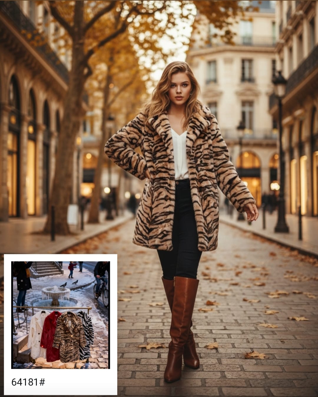 Γούνα φτιαγμένη από οικολογικά , cruelty-free υλικά που μιμούνται την υφή της φυσικής γούνας . Μαλακή στην αφή , με πλούσιο πέλος που χαρίζει ζεστασιά και κομψότητα . Γιακάς : Ένας κομψός , φαρδύς γιακάς που αγκαλιάζει το λαιμό και προσθέτει αίσθηση πολυτέλειας . Μπορεί να φορεθεί ανοιχτός για πιο χαλαρό στυλ ή κλειστό για περισσότερη προστασία από το κρύο . Κουμπιά: Μαύρα , μεγάλα κουμπιά στο μπροστινό μέρος , που δημιουργούν μια όμορφη αντίθεση με το χρώμα της γούνας . Δίνουν μια κλασική , διαχρονική πινελιά στο σχέδιο . Σιλουέτα : Ελαφρώς φαρδιά γραμμή που πέφτει άνετα στο σώμα , προσφέροντας άνεση αλλά και κομψότητα . Στυλ : Ιδανική για χειμερινές εμφανίσεις , συνδυάζει την οικολογική συνείδηση με την υψηλή αισθητική . Ταιριάζει τόσο με βραδινά όσο και με καθημερινά outfits .