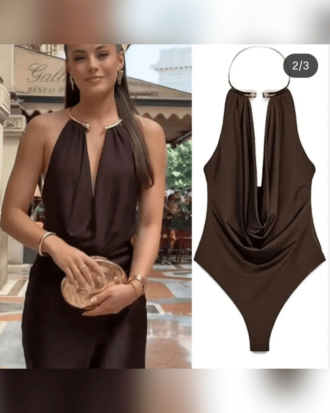 Ένα κορμάκι που συνδυάζει αισθησιακή ροή με statement λεπτομέρεια . Το ύφασμά του πέφτει ντραπέ στο μπροστινό μέρος , δημιουργώντας μαλακές πτυχώσεις που αγκαλιάζουν το μπούστο με φίνα κίνηση και θηλυκότητα . Στο λαιμό , το βλέμμα μαγνητίζει ένας διακοσμητικός κρίκος – κόσμημα , μεταλλικός και λαμπερός , που λειτουργεί σαν ενσωματωμένο αξεσουάρ . Ο κρίκος ενώνει το ύφασμα γύρω από τον λαιμό , δημιουργώντας μια αίσθηση κομψής ασυμμετρίας και προσθέτοντας glam χαρακτήρα χωρίς την ανάγκη για επιπλέον κοσμήματα . Το κορμάκι είναι εφαρμοστό στο κάτω μέρος , προσφέροντας σταθερότητα και άνεση , ενώ το επάνω μέρος παραμένει ανάλαφρο και ρευστό . Ιδανικό για βραδινές εμφανίσεις , fashion-forward looks ή ως βασικό κομμάτι σε editorial styling .