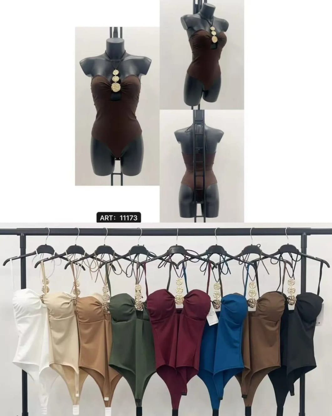 Ένα εκλεπτυσμένο κορμάκι που συνδυάζει κομψότητα και δυναμισμό . Το ύφασμα είναι ελαστικό και αγκαλιάζει το σώμα με απόλυτη εφαρμογή , αναδεικνύοντας τις καμπύλες με διακριτικό τρόπο . Το ντεκολτέ είναι βαθύ , σε σχήμα V , και στολίζεται με διακοσμητικά μεταλλικά χρυσά στοιχεία που σχηματίζουν γεωμετρικά μοτίβα , προσθέτοντας μια αίσθηση πολυτέλειας και λάμψης . Τα χρυσά στοιχεία αντανακλούν το φως , δημιουργώντας ένα εντυπωσιακό εφέ , ιδανικό για βραδινές εμφανίσεις ή ιδιαίτερες περιστάσεις . Οι λεπτομέρειες στο ντεκολτέ λειτουργούν σαν κόσμημα , καθιστώντας περιττή την ανάγκη για επιπλέον αξεσουάρ .