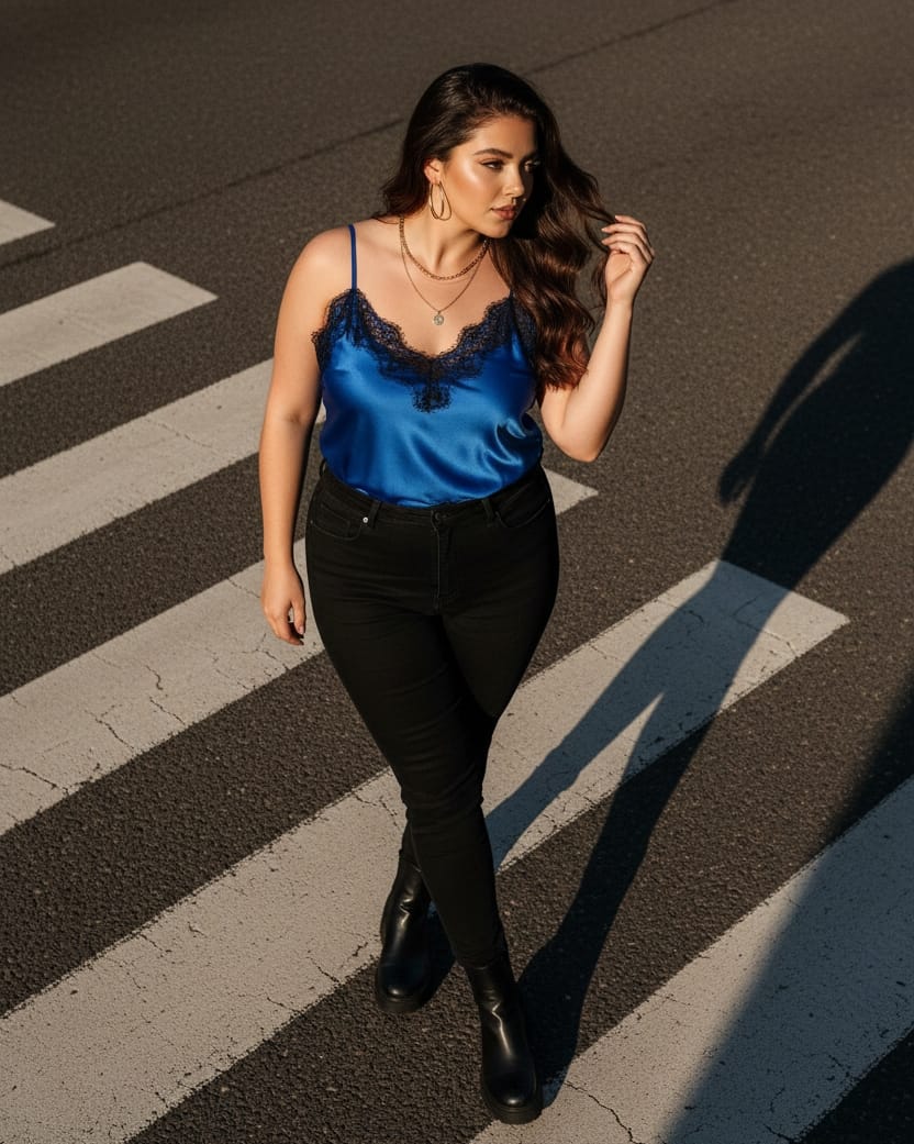 Λινζερί σχεδιασμένο ειδικά για μεγάλα μεγέθη , με έμφαση στην άνεση , τη στήριξη και την κομψότητα . Ρυθμιζόμενες , φαρδιές τιράντες που προσφέρουν σταθερό κράτημα χωρίς να πιέζουν τους ώμους . Η κατασκευή τους είναι ενισχυμένη ώστε να στηρίζουν άνετα το στήθος .  Το μπροστινό μέρος είναι διακοσμημένο με λεπτοδουλεμένη δαντέλα , με μοτίβα που δίνουν θηλυκότητα χωρίς υπερβολές . Η δαντέλα είναι ελαστική , ώστε να αγκαλιάζει το σώμα χωρίς να τεντώνει άκομψα . Η γραμμή είναι ανατομική , σχεδιασμένη να κολακεύει τις καμπύλες και να προσφέρει άνεση σε όλη τη διάρκεια της ημέρας . Το ύφασμα έχει απαλή υφή και ελαστικότητα για άνετη εφαρμογή . Θηλυκό , κομψό και διακριτικά ρομαντικό , με έμφαση στο να κάνει κάθε σώμα να νιώθει όμορφο και άνετο .