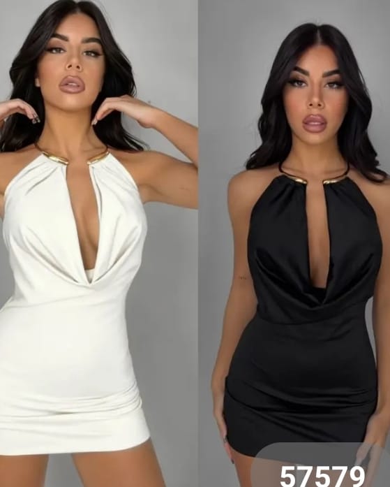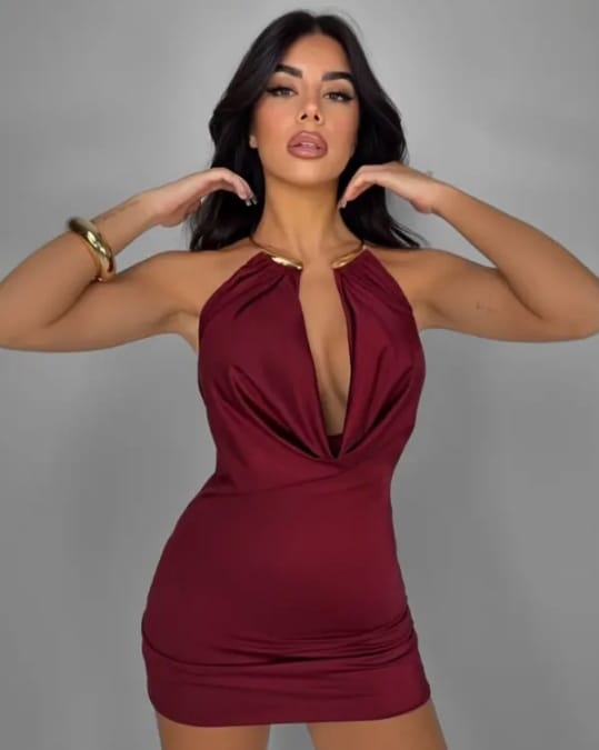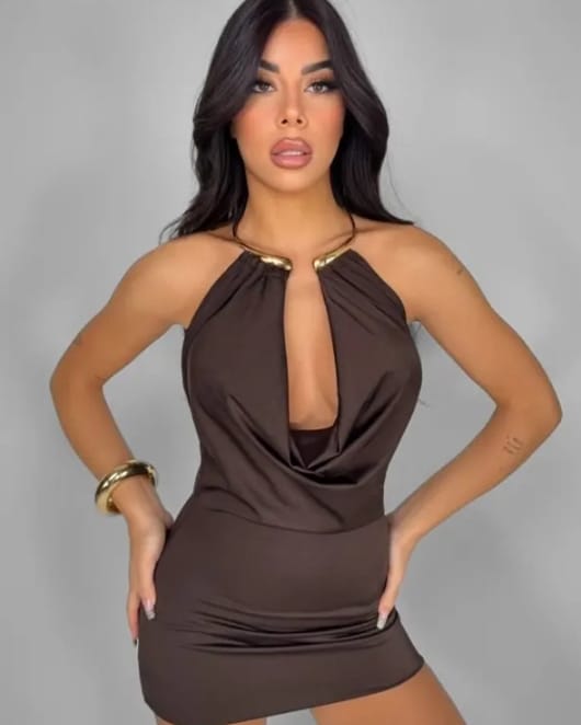 Ένα φόρεμα που αποπνέει αισθησιακή φινέτσα και διακριτική πολυτέλεια . Το μήκος του φτάνει πάνω από το γόνατο , αγκαλιάζοντας τη σιλουέτα με θηλυκή γραμμή . Το ντεκολτέ είναι ανοιχτό , με ελαφρώς ντραπέ πτύχωση , που δημιουργεί ρευστότητα και κίνηση στο ύφασμα , προσθέτοντας βάθος και κομψότητα στο επάνω μέρος . Το βλέμμα μαγνητίζει το χρυσό κόσμημα που αγκαλιάζει τον λαιμό , ενσωματωμένο στο σχέδιο του φορέματος σαν statement λεπτομέρεια . Μπορεί να είναι μεταλλικός κρίκος , που λειτουργεί σαν “κολιέ” , προσδίδοντας λάμψη και αρχοντική αύρα χωρίς την ανάγκη για επιπλέον αξεσουάρ . Το ύφασμα είναι ελαφρώς ελαστικό , με σατέν  υφή , πέφτει αρμονικά στο σώμα .  Ιδανικό για βραδινές εμφανίσεις , cocktail events ή glam στιγμές που απαιτούν κομψότητα με χαρακτήρα .