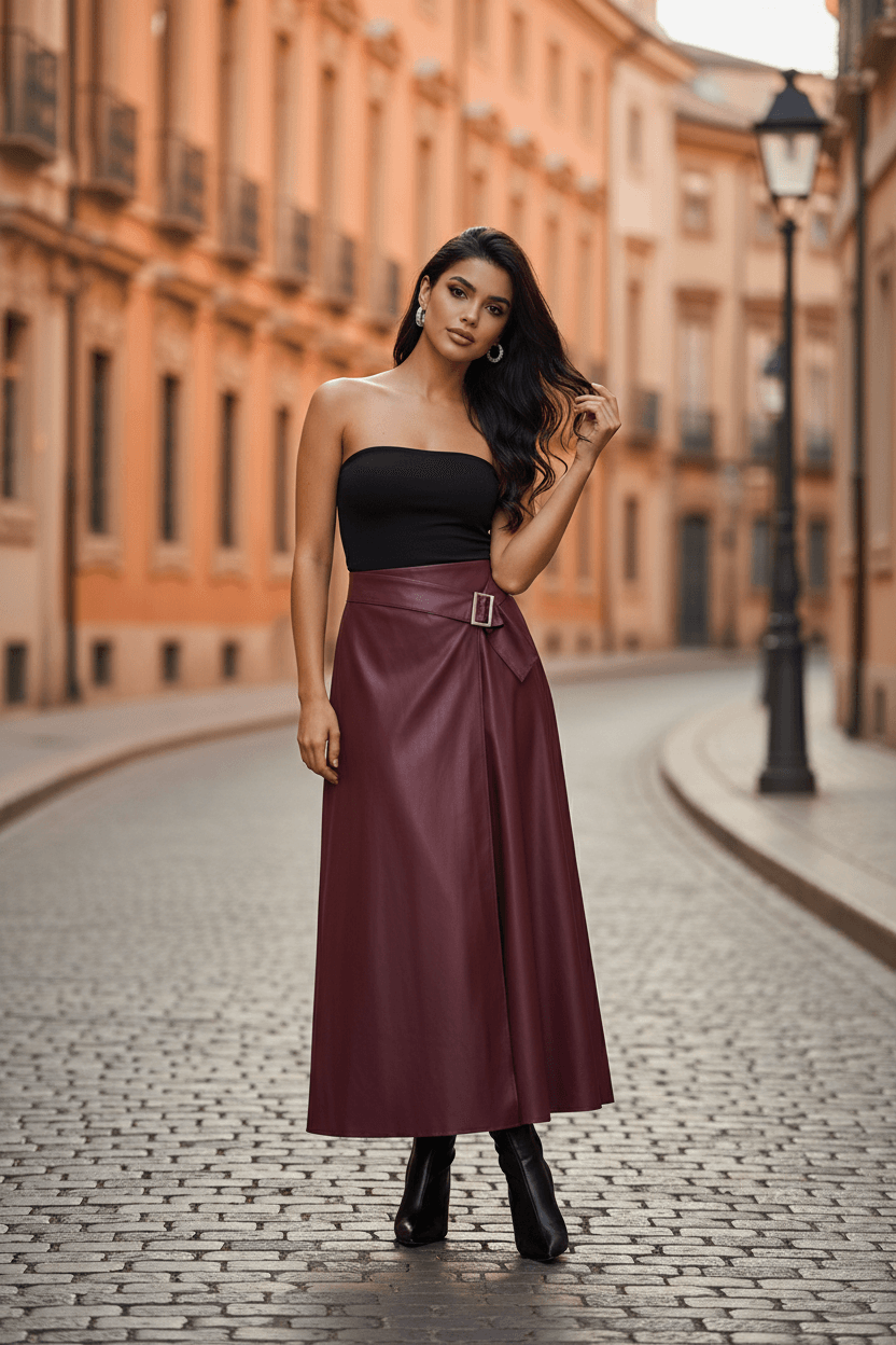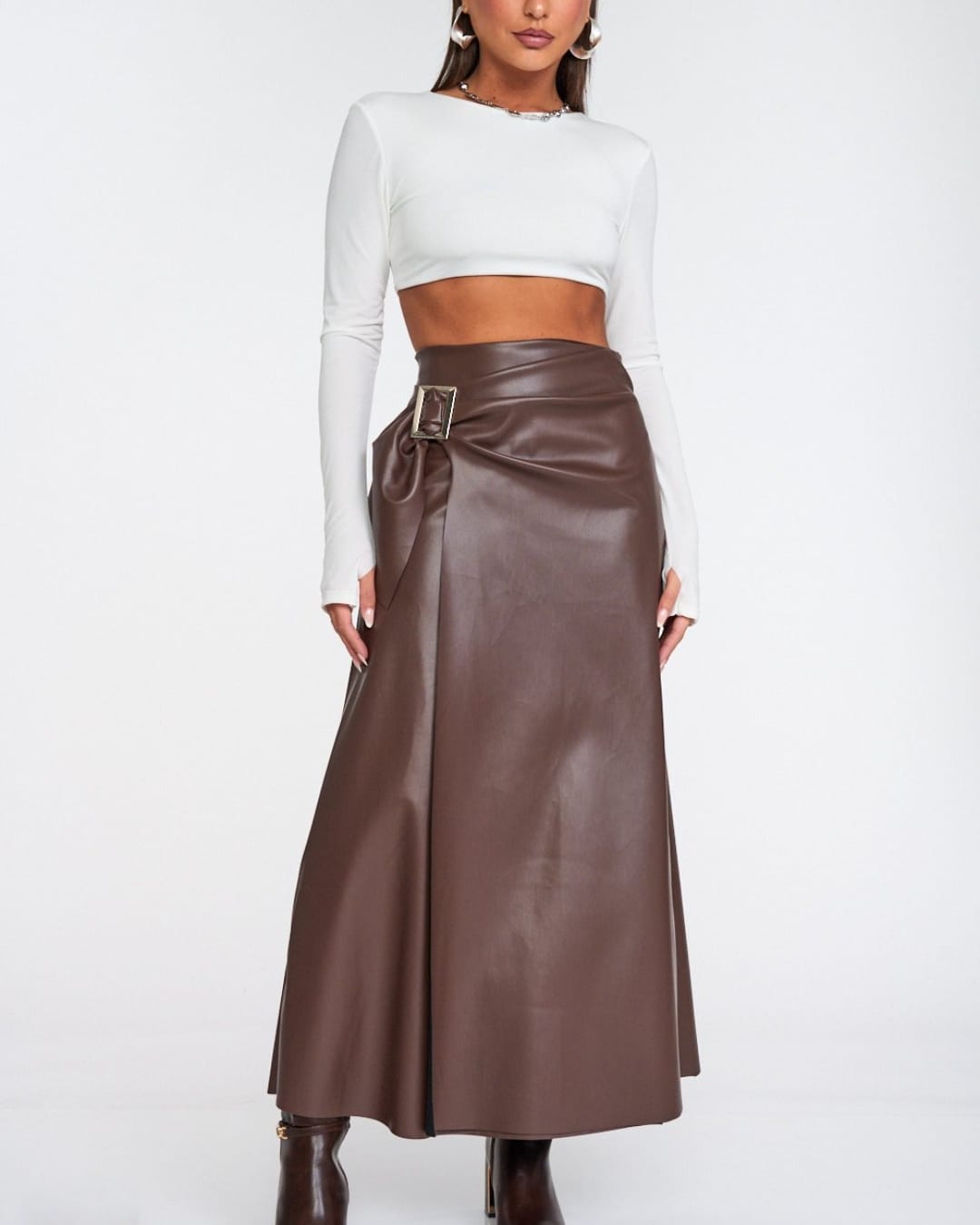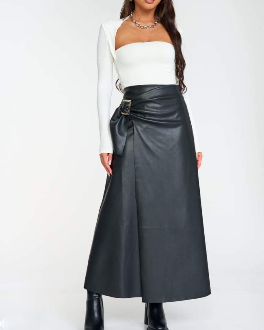 Η συγκεκριμένη φούστα είναι statement κομμάτι : η δερματίνη της δίνει δυναμισμό , η γραμμή Α την κάνει ευκολοφόρετη , το σχέδιο φακέλου προσθέτει θηλυκότητα , ενώ η αγκράφα λειτουργεί σαν κομψό στολίδι . Το φερμουάρ στο πίσω μέρος εξασφαλίζει πρακτικότητα χωρίς να αλλοιώνει την αισθητική .  Η δερματίνη χαρίζει μια πιο edgy και πολυτελή υφή , με ελαφριά γυαλάδα που κάνει τη φούστα να ξεχωρίζει .  Για το γραφείο : Συνδύασέ τη με ένα λευκό πουκάμισο και loafers ή ankle boots για ισορροπία ανάμεσα σε αυστηρό και μοντέρνο . Για βραδινή έξοδο : Ένα σατέν κορμάκι ή τοπ με λεπτές τιράντες και ψηλοτάκουνα πέδιλα θα αναδείξουν τη λάμψη της δερματίνης . Casual chic: Με ένα oversized πλεκτό και chunky sneakers , η φούστα αποκτά πιο χαλαρό χαρακτήρα χωρίς να χάνει την κομψότητά της .