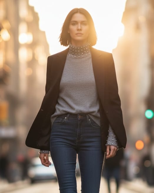 Κομψή μπλούζα ζιβάγκο που συνδυάζει minimal γραμμή με λαμπερές λεπτομέρειες . Ψηλός ζιβάγκο λαιμός , διακοσμημένος με στρας που χαρίζουν glam αίσθηση και φωτεινές αντανακλάσεις . Μανσέτες με στρας , που ολοκληρώνουν το look με πολυτελή πινελιά . Μαλακό και ελαστικό πλεκτό , που αγκαλιάζει το σώμα και προσφέρει άνεση . Στυλ : Ιδανική για βραδινές εμφανίσεις ή για να δώσει λάμψη σε ένα καθημερινό outfit .