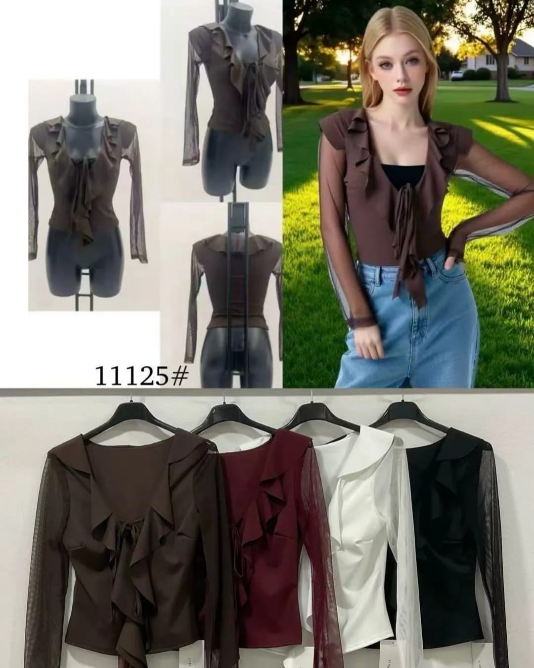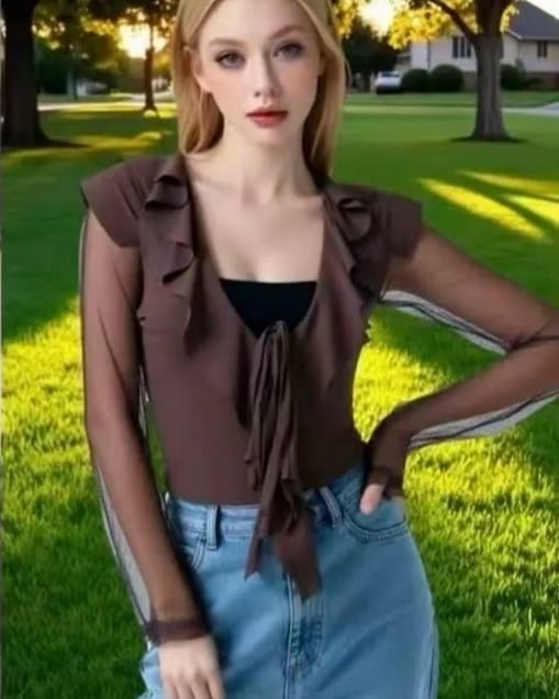Μια μπλούζα που αποπνέει θηλυκότητα και ρομαντισμό , ιδανική για εμφανίσεις με χαρακτήρα . Η διαφάνεια στα μανίκια δημιουργεί ένα παιχνιδιάρικο κοντράστ με το υπόλοιπο σώμα της μπλούζας , προσφέροντας διακριτική γοητεία . Το ντεκολτέ είναι ανοιχτό , σε σχήμα V , αναδεικνύοντας το λαιμό και το ντεκολτέ με εκλεπτυσμένο τρόπο . Στο μπροστινό μέρος , κυριαρχεί ένα βολάν που ξεκινά από το ντεκολτέ και καταλήγει προς τη μέση , προσθέτοντας κίνηση , όγκο και ρομαντική διάθεση . Το βολάν μπορεί να είναι συμμετρικό ή να ακολουθεί ασύμμετρη γραμμή , δίνοντας μοντέρνα πινελιά στο κλασικό σχέδιο . Η μπλούζα αυτή συνδυάζεται υπέροχα με ψηλόμεσα παντελόνια ή φούστες , και μπορεί να φορεθεί τόσο σε πρωινές όσο και σε βραδινές εξόδους , ανάλογα με το styling .