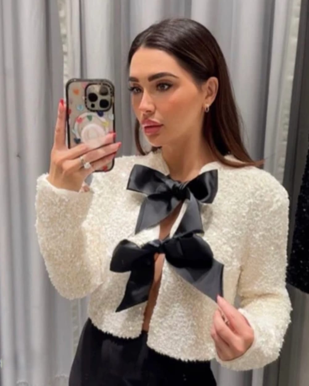 Μια εντυπωσιακή μπλούζα που συνδυάζει λάμψη , θηλυκότητα και δημιουργικό σχεδιασμό . Το ύφασμά της είναι πλήρως καλυμμένο με παγιέτες , προσφέροντας μια εκθαμβωτική επιφάνεια που αντανακλά το φως με κάθε κίνηση . Το στοιχείο – έκπληξη είναι η ανοιχτή πλευρά , η οποία δένει με μεγάλες μαύρες κορδέλες , δημιουργώντας ένα δραματικό και ρομαντικό εφέ . Οι κορδέλες πέφτουν χαλαρά ή δένονται σε φιόγκους , προσθέτοντας κίνηση και αντίθεση στην υφή της παγιέτας . Το πιο ξεχωριστό χαρακτηριστικό ; Η μπλούζα μπορεί να φορεθεί και ανάποδα . Η ανοιχτή πλευρά με τις κορδέλες μετατρέπεται σε εντυπωσιακή πλάτη , ενώ το μπροστινό μέρος γίνεται πιο κλειστό και κομψό . Αυτή η διπλή δυνατότητα προσφέρει ευελιξία και σου επιτρέπει να προσαρμόσεις το look σου ανάλογα με τη διάθεση ή την περίσταση . Ιδανική για βραδινές εμφανίσεις , fashion-forward looks ή φωτογραφήσεις , αυτή η μπλούζα είναι ένα κομμάτι που δεν περνά απαρατήρητο .