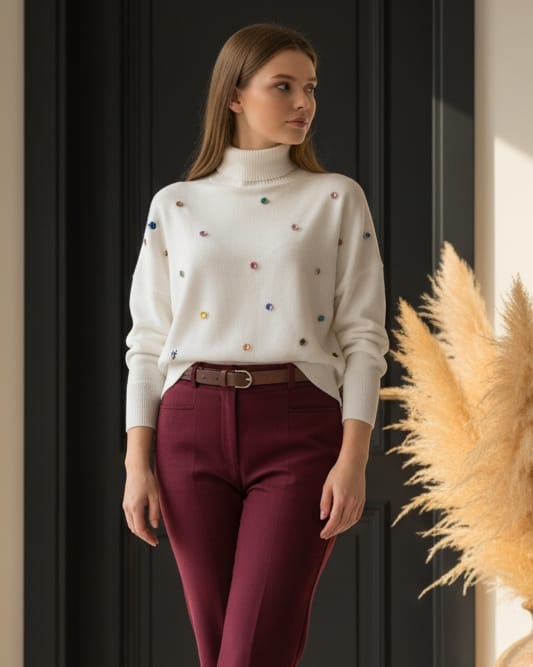 Πλεκτή Ζιβάγκο Μπλούζα με Χρωματιστές Πέτρες – ΄΄Decorated Turtleneck Knit with Color Stones΄΄ – AD