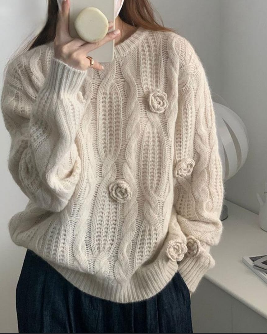 Πουλόβερ με χοντρό βελονάκι & διακοσμητικά Τρισδιάστατα Λουλούδια – ”Bloom Sweater” – LO