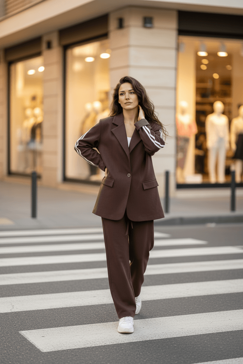 Στα πλαϊνά του σακακιού διατρέχει μια λεπτή ρίγα , που χαρίζει μοντέρνο χαρακτήρα και μια ελαφριά sporty πινελιά χωρίς να χάνει την κομψότητά του . Το παντελόνι συνδυάζει άνεση και στιλ : Στη μέση διαθέτει λάστιχο για άνετη εφαρμογή και κορδόνι για ρύθμιση . Έχει πλαϊνές τσέπες , πρακτικές και διακριτικές . Στα πλαϊνά του ποδιού υπάρχει διακοσμητική ρίγα , που συνδέει οπτικά το παντελόνι με το σακάκι και δίνει στο σύνολο μια ενιαία , σύγχρονη αισθητική . Ένα σετ κουστουμιού που συνδυάζει την κλασική ραπτική με μοντέρνα , αθλητικά στοιχεία . Το αποτέλεσμα είναι ένα look που παραμένει κομψό αλλά πιο χαλαρό , ιδανικό για όσους θέλουν να ξεχωρίζουν με ένα σύνολο που είναι ταυτόχρονα άνετο και στιλάτο .