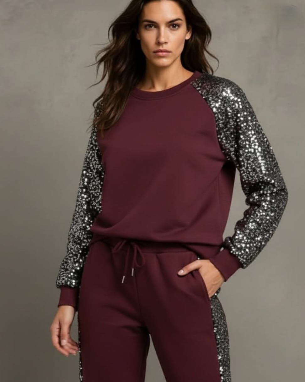 Σετ φόρμας γυναικεία με παγιέτες στα μανίκια και παντελόνι – άνεση και λάμψη σε κάθε εμφάνιση – “Sequin Glam Tracksuit Set” – LO