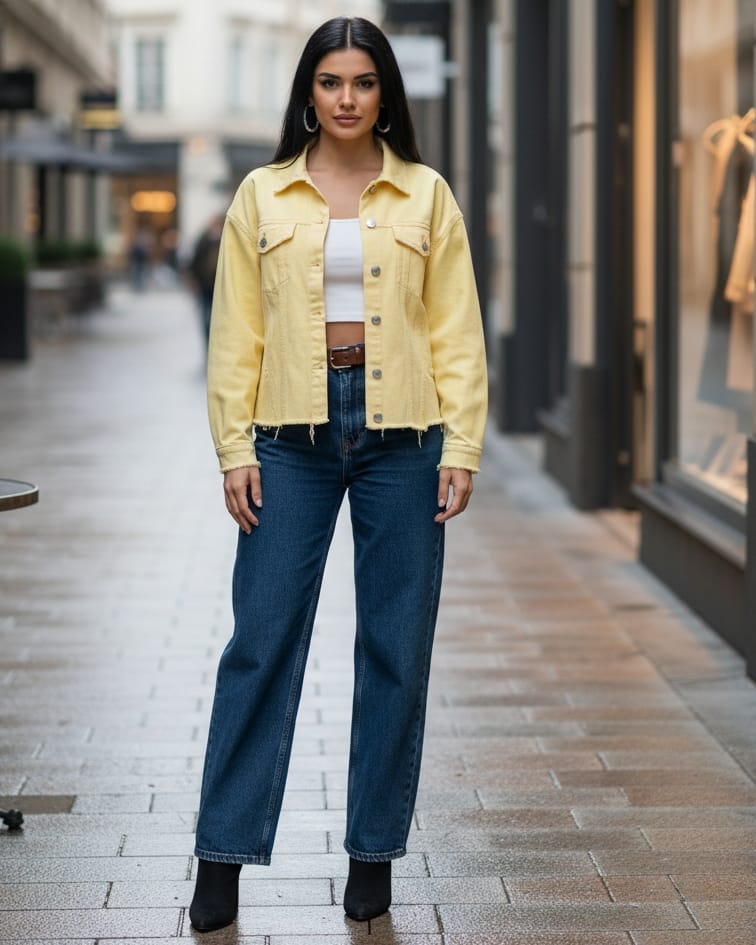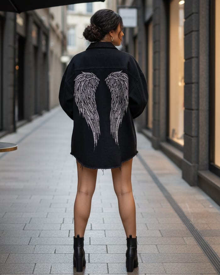 Τζίν denim τζάκετ ,  με ελαφρώς «σπασμένο» look για πιο edgy ύφος . Απλό και καθαρό ,  ώστε όλη η προσοχή να πέφτει στο πίσω σχέδιο . . Μεγάλα φτερά αγγέλου , σχεδιασμένα ώστε να καλύπτουν σχεδόν όλη την πλάτη . Τα φτερά αποτελούνται από στρας , που δημιουργούν τρισδιάστατη αίσθηση . Η λάμψη των στρας δίνει την εντύπωση ότι τα φτερά «κινούνται» όταν πέφτει πάνω τους το φως .  Συνδυάζει glam , streetwear και λίγο fantasy αισθητική . Είναι το είδος του κομματιού που γίνεται statement από μόνο του .