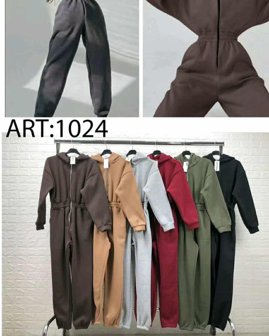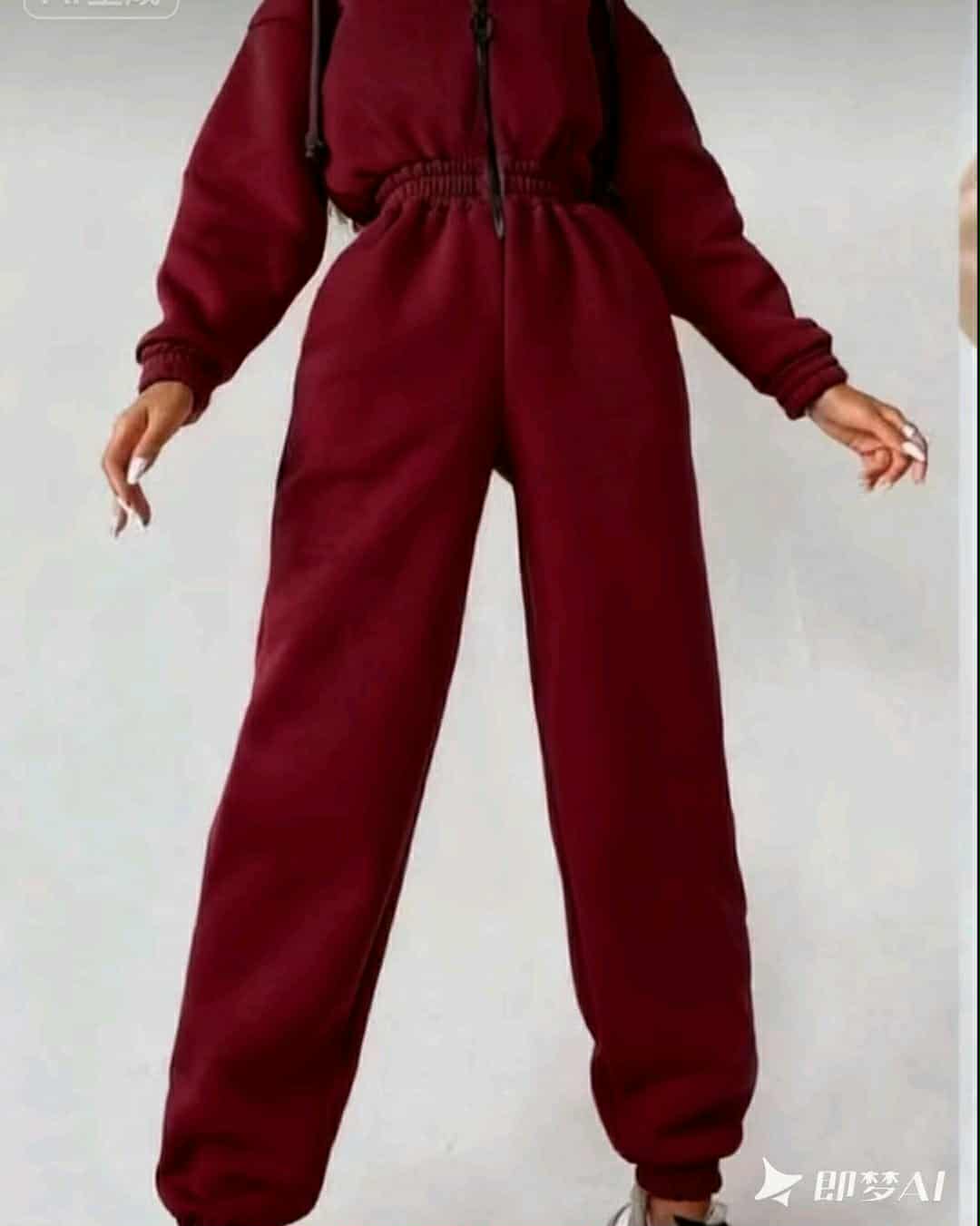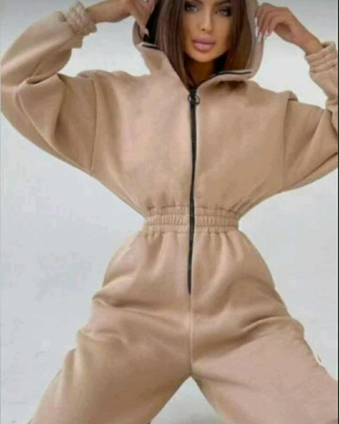 Η φόρμα είναι ολόσωμη , σχεδιασμένη για άνεση και στυλ , ιδανική για casual εμφανίσεις ή χαλάρωση στο σπίτι . Είναι φτιαγμένη από μαλακό φούτερ ύφασμα που προσφέρει ζεστασιά και ευχάριστη αίσθηση στο δέρμα . Η Κουκούλα  προσφέρει προστασία από τον αέρα και προσθέτει streetwear χαρακτήρα . Το φερμουάρ μπροστά εκτείνεται από το λαιμό μέχρι τη μέση , διευκολύνοντας το ντύσιμο και προσθέτοντας πρακτικότητα . Το λάστιχο στη μέση αγκαλιάζει το σώμα , δημιουργώντας σχήμα και προσφέροντας σταθερότητα χωρίς να πιέζει .