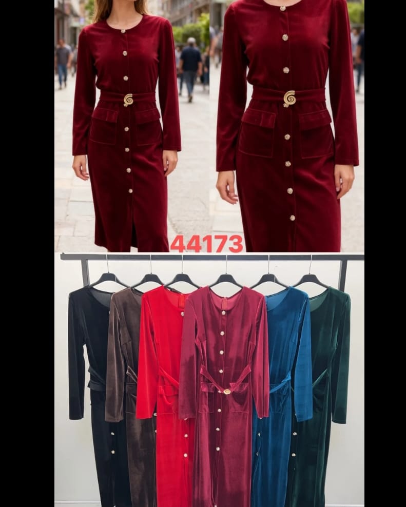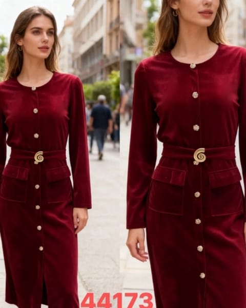 Κομψό βελούδινο φόρεμα που αποπνέει πολυτέλεια και διαχρονικό στυλ . Κατασκευασμένο από μαλακό βελούδο , αγκαλιάζει τη σιλουέτα με εκλεπτυσμένη άνεση . Τα διακοσμητικά χρυσά κουμπιά κατά μήκος του φορέματος προσθέτουν λάμψη και κομψότητα , ενώ η ζώνη με χρυσή αγκράφα τονίζει τη μέση και αναδεικνύει τη θηλυκή γραμμή . Τα διακοσμητικά καπάκια τσεπών ολοκληρώνουν το design με μια πινελιά κλασικής φινέτσας . Ένα φόρεμα ιδανικό για βραδινές εξόδους και ιδιαίτερες περιστάσεις , που συνδυάζει άνεση και ακαταμάχητη κομψότητα .