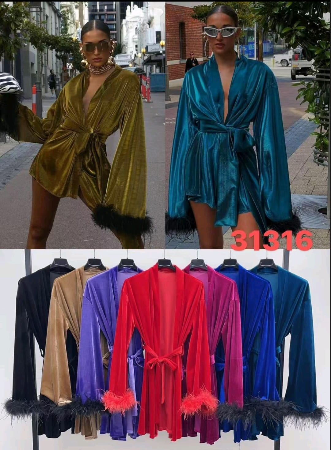 Βελούδινο φόρεμα που μπορεί να φορεθεί ως μπλουζοφόρεμα ή πανωφόρι , ανάλογα με τη διάθεση και την περίσταση . Έχει φαρδιά μανίκια καμπάνα που προσθέτουν κίνηση και δραματικότητα , με διακοσμητικά πούπουλα στο τελείωμά τους που δίνουν μια πολυτελή και παιχνιδιάρικη πινελιά . Δένει με ζώνη στη μέση , προσδίδοντας στυλ και σχήμα στη σιλουέτα . Ένα κομμάτι που αποπνέει κομψότητα και ευελιξία , ιδανικό για να κάνεις εντύπωση !