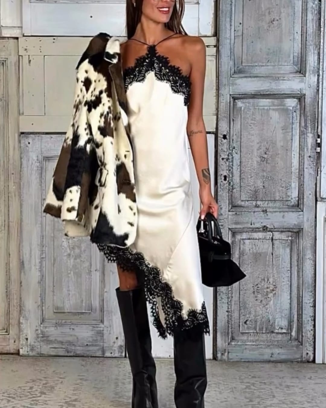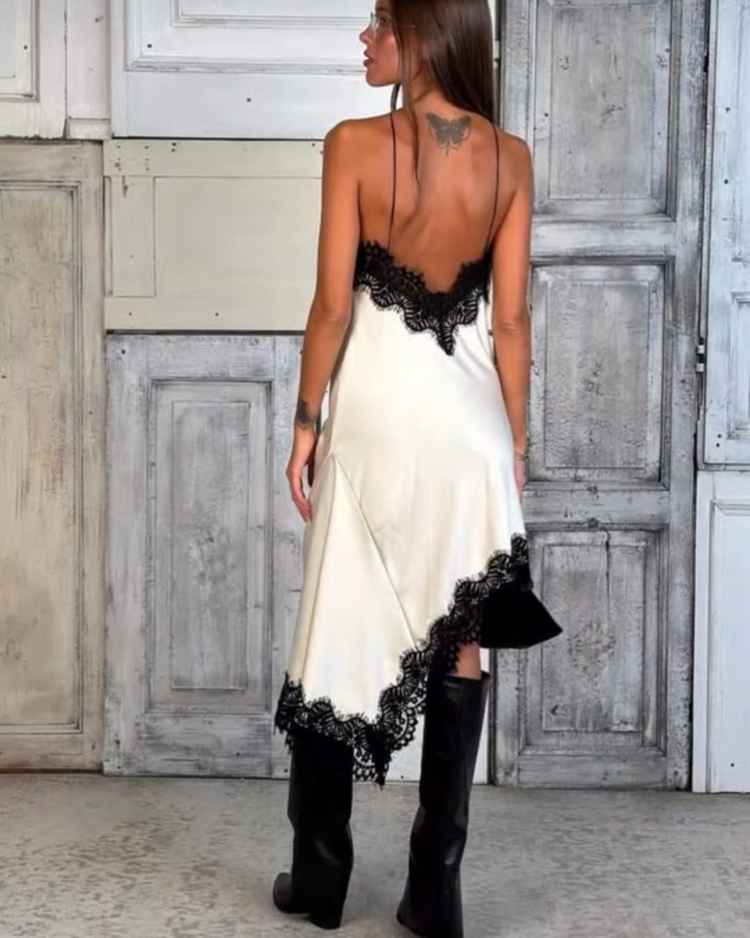Απαλό σατέν , με ελαφριά γυαλάδα που αγκαλιάζει το σώμα και αναδεικνύει τις καμπύλες . Το μπούστο είναι διακοσμημένο με φίνα δαντέλα σε λουλουδένιο μοτίβο , ημιδιάφανη , που προσθέτει ρομαντισμό και αισθησιασμό . Η δαντέλα αγκαλιάζει το στήθος με καμπύλες και τελειώνει σε scalloped άκρες . Οι τιράντες είναι λεπτές , σατινέ , και φθάνουν ως χαμηλά στη πλάτη αφήνοντάς την ανοιχτή και εντυπωσιακή . Το φόρεμα έχει ελαφρώς Α-line γραμμή , ώστε να αγκαλιάζει τη μέση και να πέφτει απαλά στους γοφούς . Το ύφασμα είναι ελαφρύ και αέρινο , με κίνηση που ακολουθεί κάθε βήμα . Το τελείωμα είναι ασύμμετρο , με τη δαντέλα να συνεχίζει και να σχηματίζει μια αέρινη ουρά στο πλαϊνό μέρος . Η δαντέλα στο κάτω μέρος είναι ίδιας αισθητικής με το μπούστο , δημιουργώντας μια αρμονική ισορροπία . Το ασύμμετρο κόψιμο προσθέτει δραματικότητα και κομψότητα .