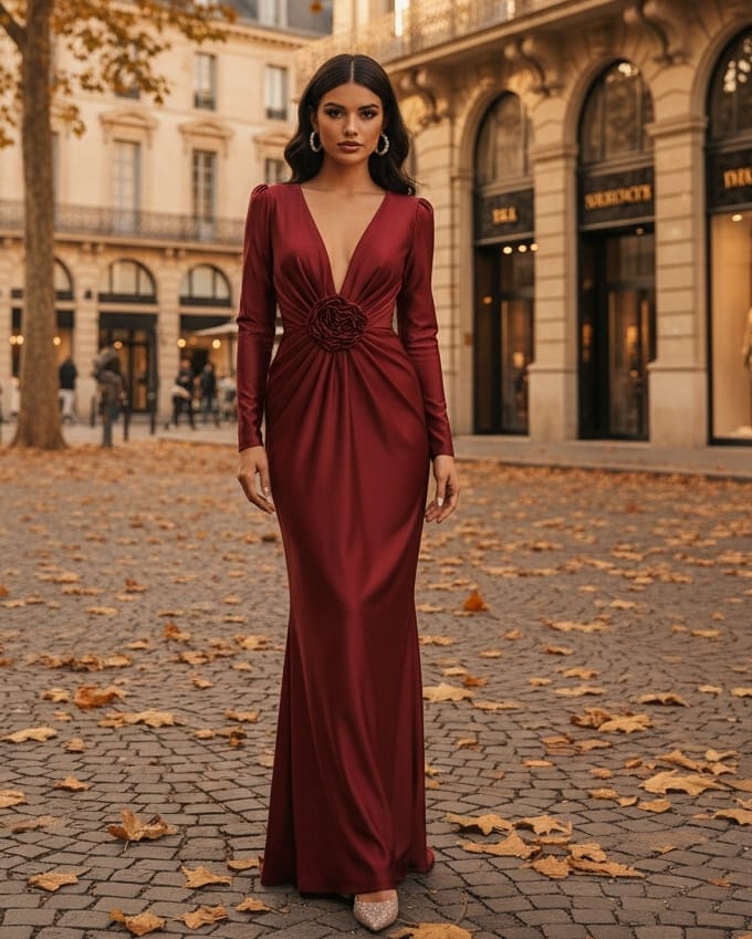 Ένα maxi φόρεμα από ελαστική , γυαλιστερή λύκρα , που αγκαλιάζει το σώμα και αναδεικνύει τη σιλουέτα με κομψότητα και λάμψη . Το ύφασμα έχει μια διακριτική γυαλάδα που δίνει πολυτελή αίσθηση και κίνηση . Το επάνω μέρος διαθέτει ανοιχτό V ντεκολτέ , που προσφέρει θηλυκότητα και ισορροπεί όμορφα με τη μακριά γραμμή του φορέματος . Στο μπροστινό μέρος υπάρχουν σούρες , οι οποίες κολακεύουν τη μέση και δημιουργούν ένα ραφιναρισμένο , sculpting αποτέλεσμα . Στο κέντρο του φορέματος δεσπόζει ένα μεγάλο τρισδιάστατο λουλούδι , που λειτουργεί ως statement διακοσμητικό στοιχείο και δίνει στο σύνολο μια couture αισθητική . Το φόρεμα διαθέτει βάτες , προσφέροντας δομή στους ώμους και δημιουργώντας μια πιο εντυπωσιακή , ισορροπημένη σιλουέτα .
