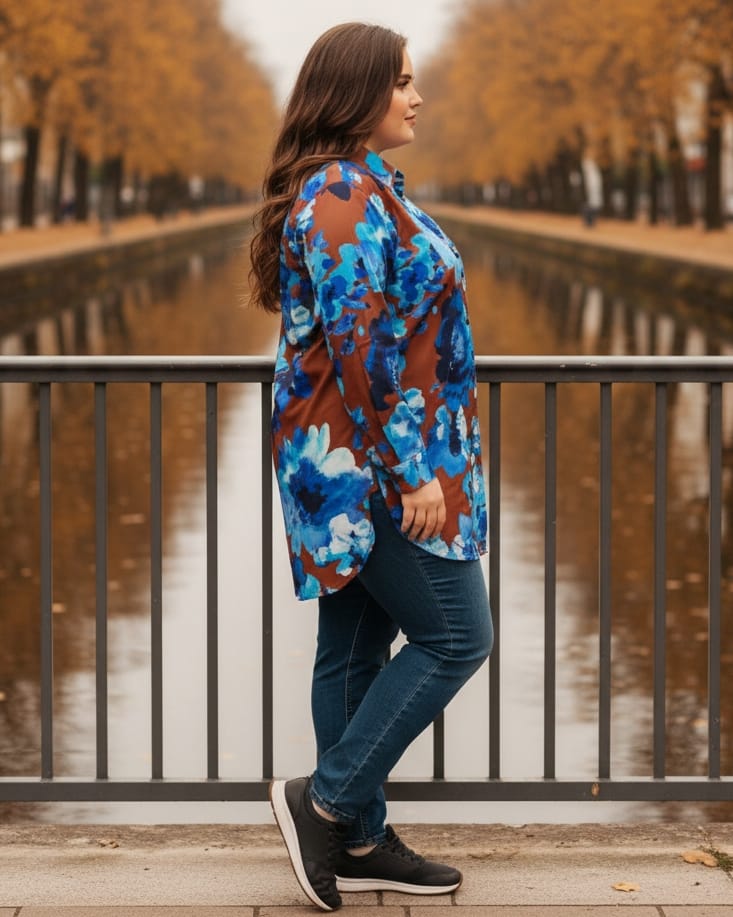 Μια κομψή εμπριμέ πουκαμίσα , σχεδιασμένη ειδικά για μεγάλα μεγέθη , με άνετη γραμμή που αγκαλιάζει όμορφα το σώμα χωρίς να το πιέζει . Το ύφασμα είναι ελαφρύ και δροσερό , προσφέροντας ευχάριστη αίσθηση και άψογη εφαρμογή στην καθημερινή χρήση . Το εμπριμέ μοτίβο — σε πολύχρωμες , ζωντανές αποχρώσεις — δίνει χαρακτήρα και στυλ , ενώ η ασύμμετρη σχεδίαση προσθέτει μια μοντέρνα πινελιά : η πίσω πλευρά είναι ελαφρώς πιο μακριά από την μπροστινή , δημιουργώντας μια κολακευτική γραμμή που χαρίζει άνεση και κίνηση . Η πουκαμίσα διαθέτει χαλαρή εφαρμογή , διακριτό γιακά , και μανίκια που μπορούν να είναι μακριά ή 3/4 , προσφέροντας ευελιξία στο στυλ .