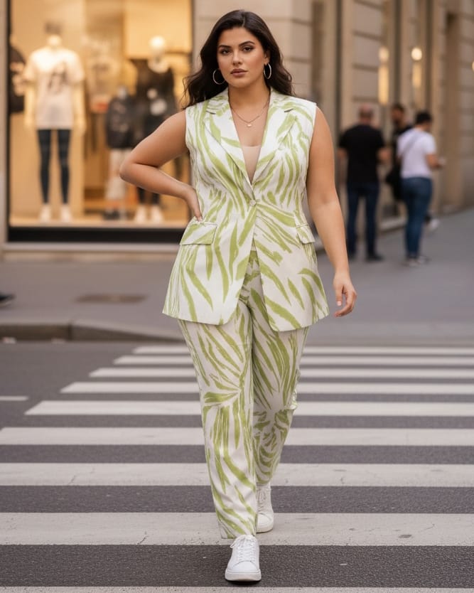 Ένα δροσερό και εντυπωσιακό εμπριμέ σετ με πολύχρωμα μοτίβα πάνω σε λευκή βάση , που χαρίζει φρεσκάδα και ζωντάνια σε κάθε εμφάνιση . Το αμάνικο γιλέκο διαθέτει καθαρή γραμμή , διακοσμητικές τσέπες που προσθέτουν μια πινελιά κομψότητας και εφαρμογή που κάθεται όμορφα στο σώμα χωρίς να το βαραίνει . Το παντελόνι ολοκληρώνει το σύνολο με άνεση και πρακτικότητα , χάρη στο λάστιχο στη μέση που προσφέρει ευελιξία και σταθερή εφαρμογή . Η γραμμή του είναι χαλαρή και αέρινη , ιδανική για καθημερινές εμφανίσεις αλλά και πιο προσεγμένες στιγμές . Το αποτέλεσμα είναι ένα σετ που συνδυάζει άνεση , χρώμα και στυλ , ιδανικό για όσες θέλουν ένα outfit που ξεχωρίζει χωρίς προσπάθεια .