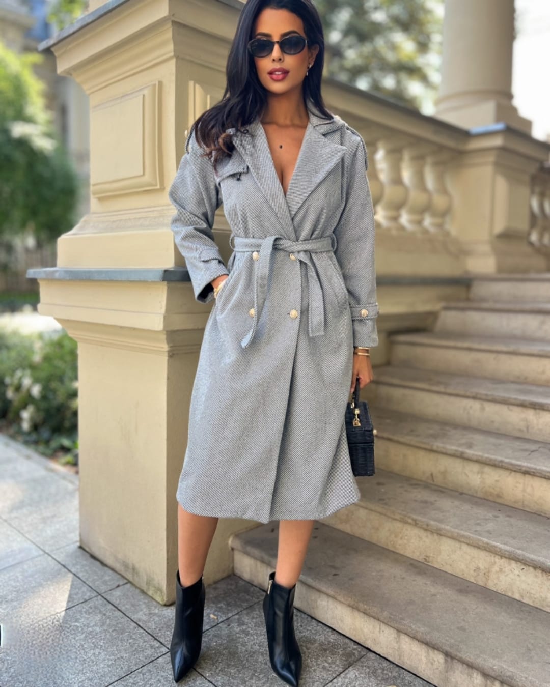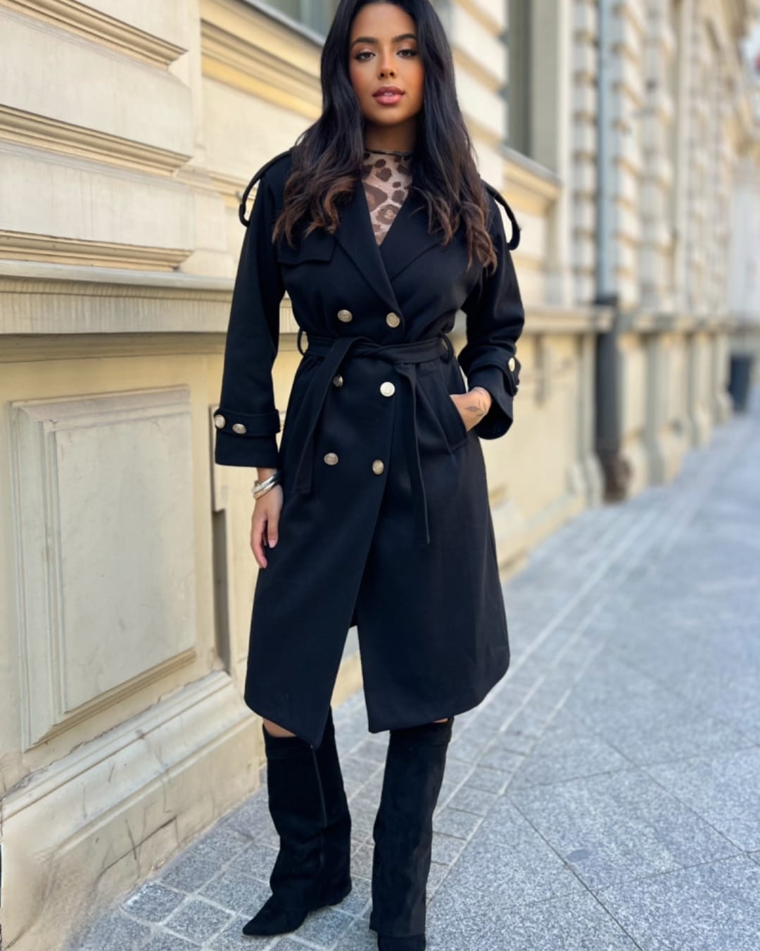 Ένα διαχρονικό παλτό που συνδυάζει κλασική φινέτσα με μοντέρνες πινελιές , ιδανικό για τις πιο κομψές χειμερινές εμφανίσεις . Το παλτό αυτό ξεχωρίζει για την προσεγμένη του κατασκευή και τις εκλεπτυσμένες λεπτομέρειες : Κλασικός γιακάς , που προσδίδει δομή και κομψότητα στο σύνολο , ιδανικός για layering με πουκάμισα ή ζιβάγκο . Διακοσμητικά χρυσά κουμπιά , τοποθετημένα συμμετρικά στο μπροστινό μέρος & στα μανίκια , που προσθέτουν λάμψη και πολυτέλεια . Ζώνη στη μέση , από το ίδιο ύφασμα , που τονίζει τη σιλουέτα και επιτρέπει ευελιξία στο styling — φοριέται δεμένο ή χαλαρά . Το παλτό αυτό είναι ιδανικό για να φορεθεί πάνω από φορέματα , κοστούμια ή ακόμα και casual looks με τζιν και μπότες , προσθέτοντας πάντα μια αίσθηση αρχοντικής κομψότητας .